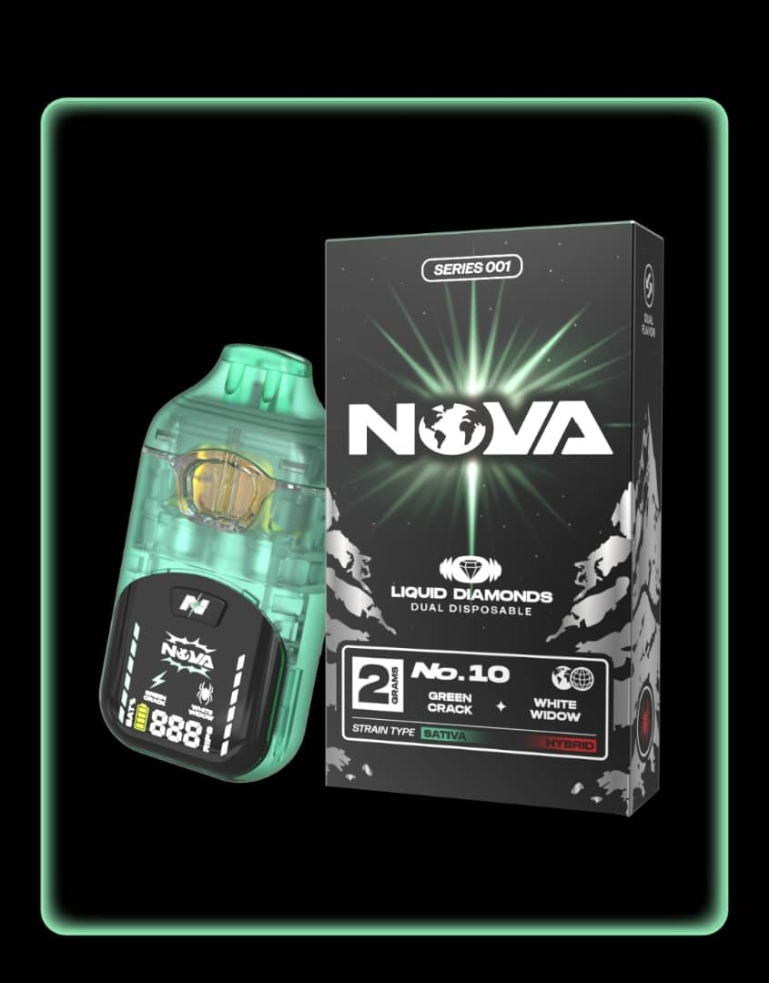At the core of the Nova 2G Disposable is a 2-gram liquid diamonds formulation, designed to preserve potency, terpene expression, and smooth vapor consistency. Unlike standard distillate systems, the Nova 2G Disposable uses a more refined extract process that emphasizes cannabinoid purity and flavor richness. This extraction style allows the Nova Green Crack + White Widow Dual Disposable to deliver a progressive and controlled effect profile, where the Green Crack chamber offers bright mental stimulation, while the White Widow chamber supports balanced clarity and calm focus.